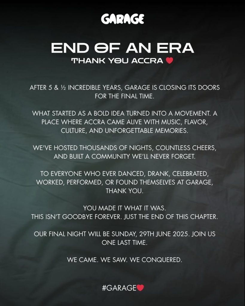 After five and a half years of music, mischief, and memories, Accra’s beloved nightlife haven, Garage, is calling last orders. The East Legon favorite announced on Instagram that Sunday, June 29, 2025, will be its final night — and it’s shaping up to be a big one.