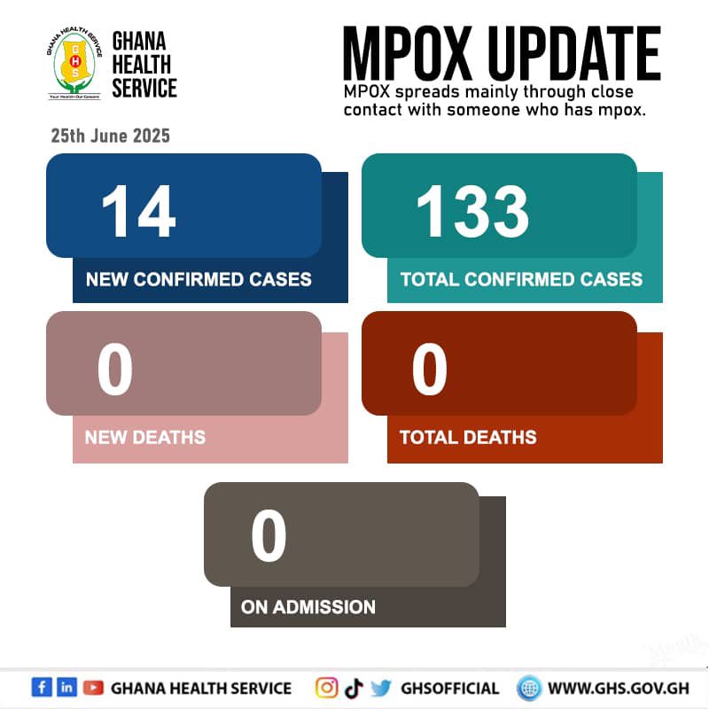 The Ghana Health Service (GHS) has confirmed 14 new cases of Mpox, bringing the country’s total number of infections to 133 as of June 25, 2025.